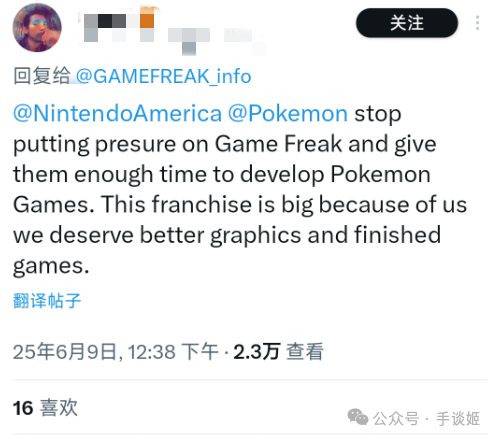 “別再給Game Freak施壓了,給他們足夠的時間開發寶可夢遊戲。這個系列能做大靠的是我們玩家,我們理應獲得更好的畫面和更完善的遊戲體驗。”