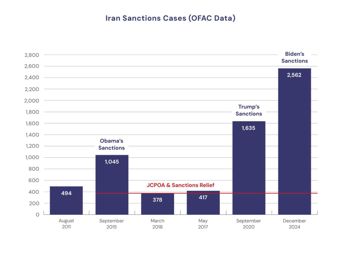 第三階段(2018年至今):2018年5月8日,美國正式退出《聯合全面行動計劃》,並恢復所有此前解除的制裁,旨在對伊朗施加“最大程度的壓力”。隨後,特朗普政府重新分類了部分制裁措施。有1139個實體和個人被新列入制裁清單,至2020年底,共有1635個實體和個人遭到制裁。特朗普總統首個任期結束後,伊朗與拜登政府曾恢復過間接對話,旨在恢復協議。但談判並未獲得成功,截至2024年12月,制裁總數升至2562項。