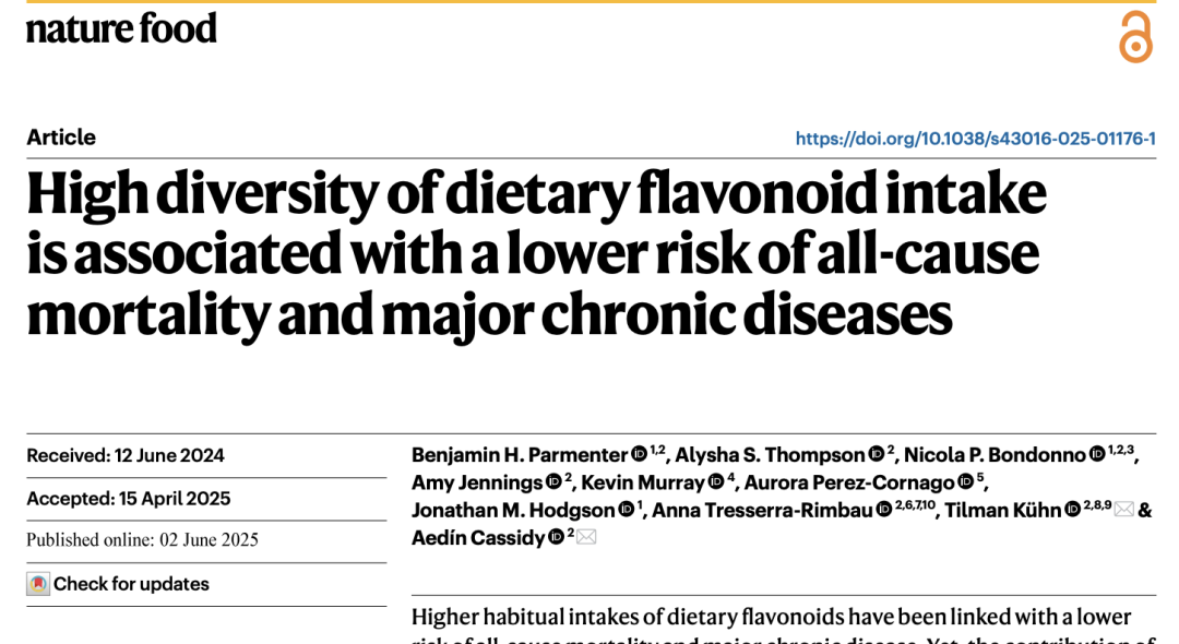 [1]Parmenter, B.H., Thompson, A.S., Bondonno, N.P. et al. High diversity of dietary flavonoid intake is associated with a lower risk of all-cause mortality and major chronic diseases. Nat Food (2025). https://doi.org/10.1038/s43016-025-01176-1