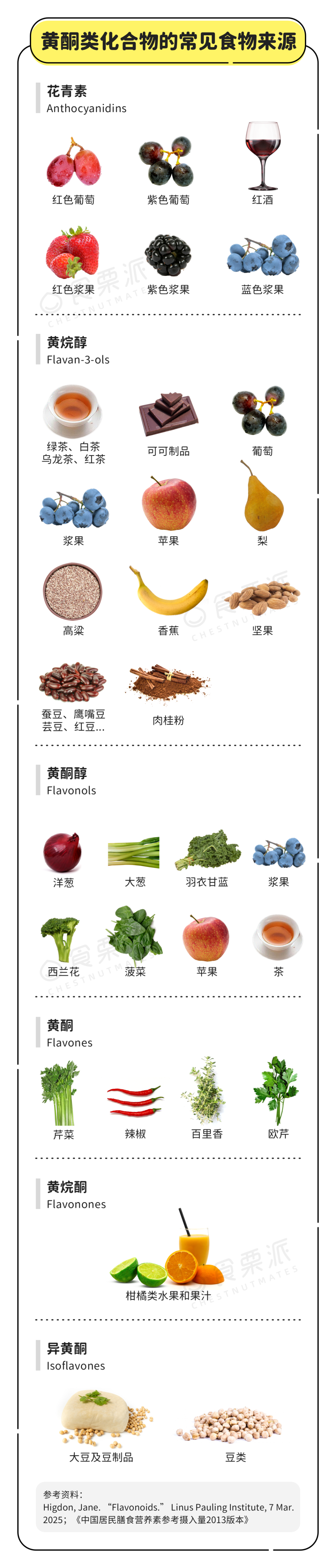 這當中有大家可能比較熟悉的花青素(Anthocyanidins)、異黃酮(Isoflavones),可能聽説過的黃烷醇(Flavan-3-ols);還有不太熟悉的黃酮醇(Flavonols)、黃酮(Flavones)、黃烷酮(Flavonones)。