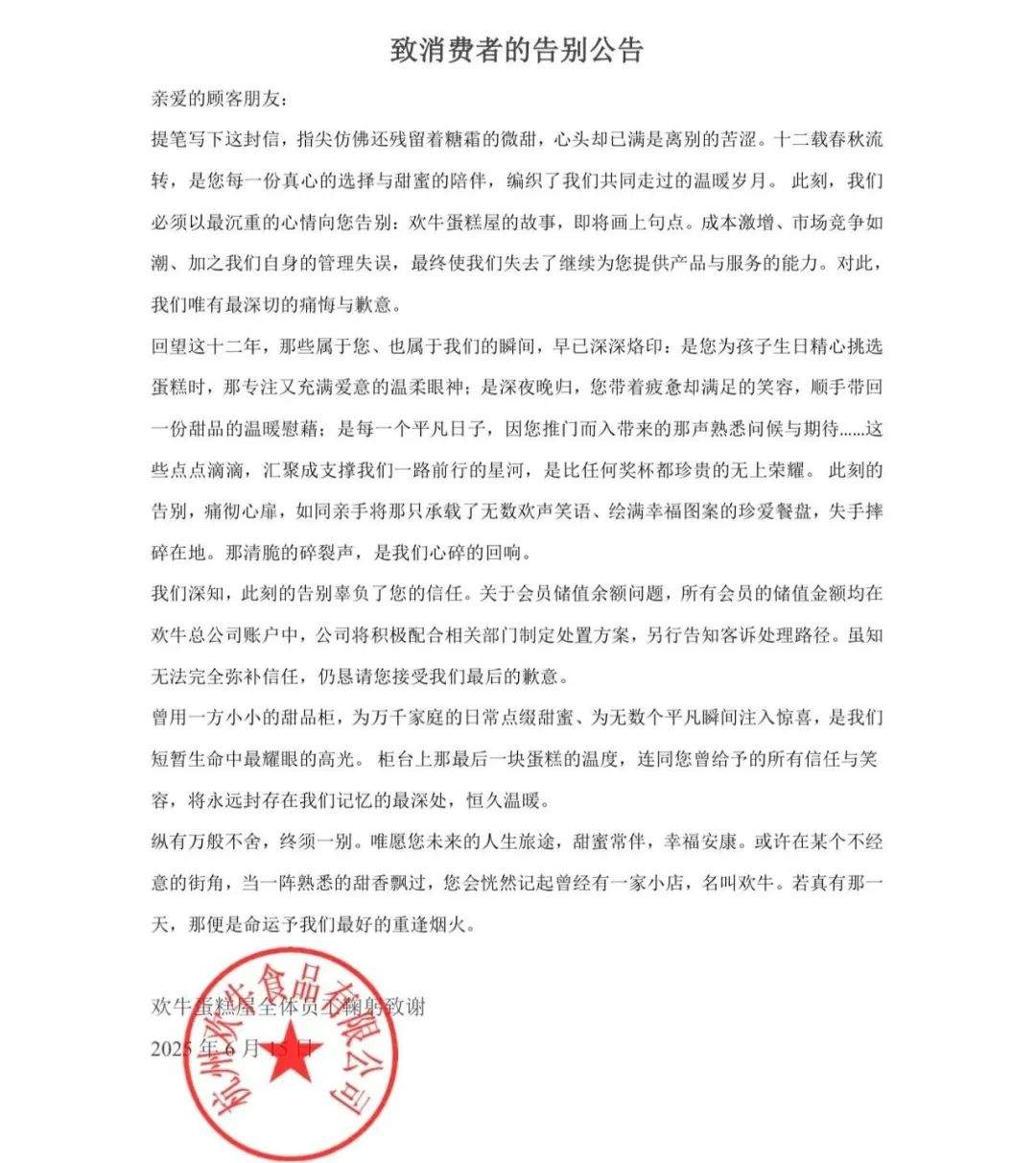 在公告中,歡牛蛋糕屋多次向消費者致歉,但並未提及後續品牌動作,以及門店是否還將繼續運營。