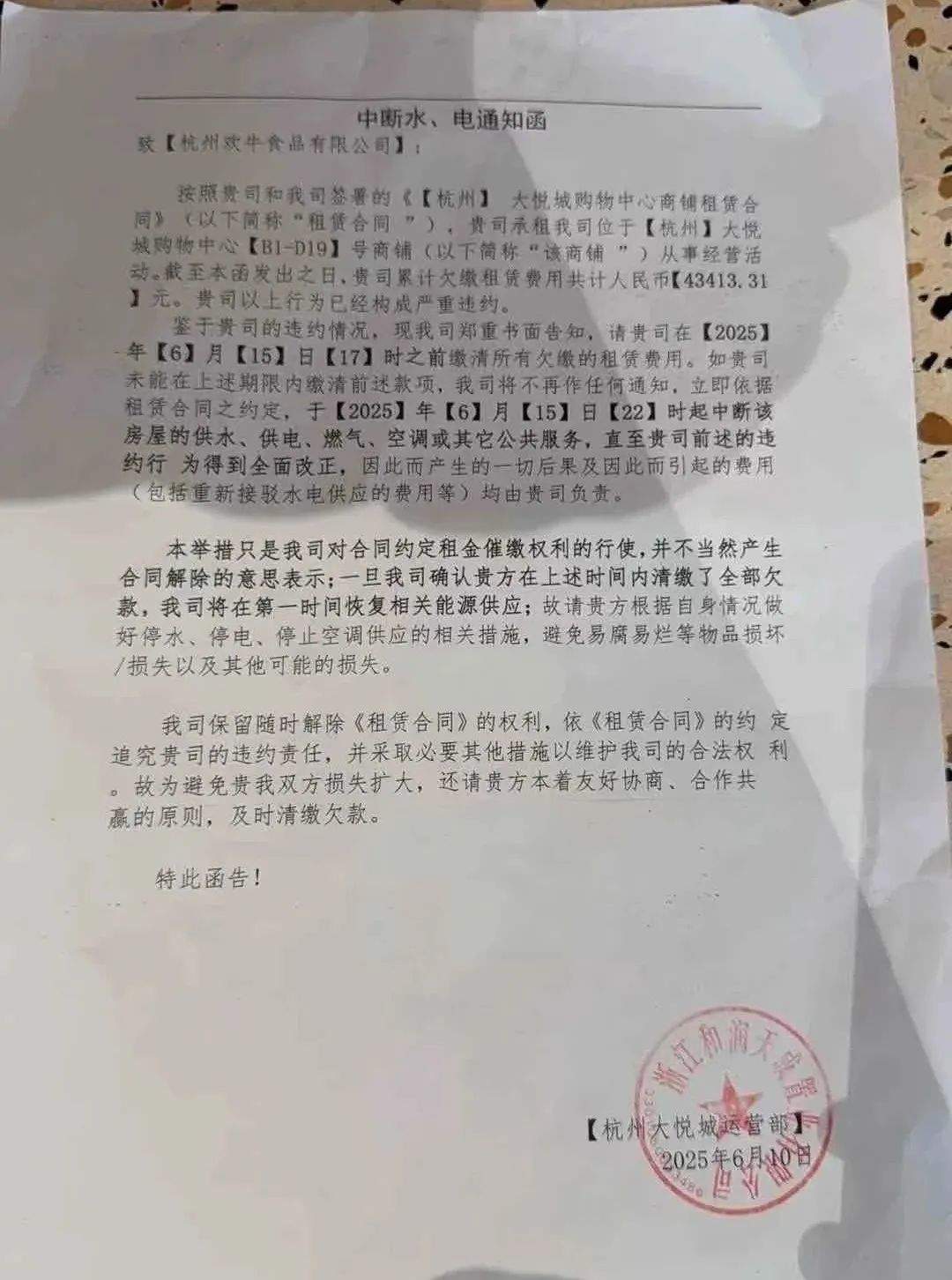 在公告中,大悦城方面稱,歡牛蛋糕屋拖欠4.34萬元租金,商場已於6月15日22時停了該店鋪的供水、供電、燃氣等服務。