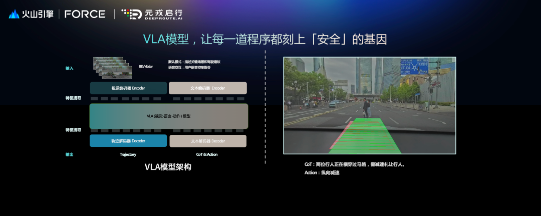 關於新一代的VLA模型有什麼功能,理想在今年3月份的GTC上已經給了一些小小的劇透;而最近一週內,元戎啓行的CEO周光在火山引擎Force大會上披露了更多細節。元戎重點展示了基於VLA 4個主要的能力: