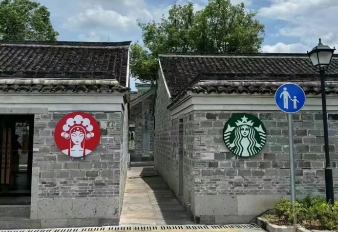 有網友路過寧波慈城古鎮,發現一張“貼臉開大”的神圖——霸王茶姬和星巴克對着開,東方美女大戰西方海妖。