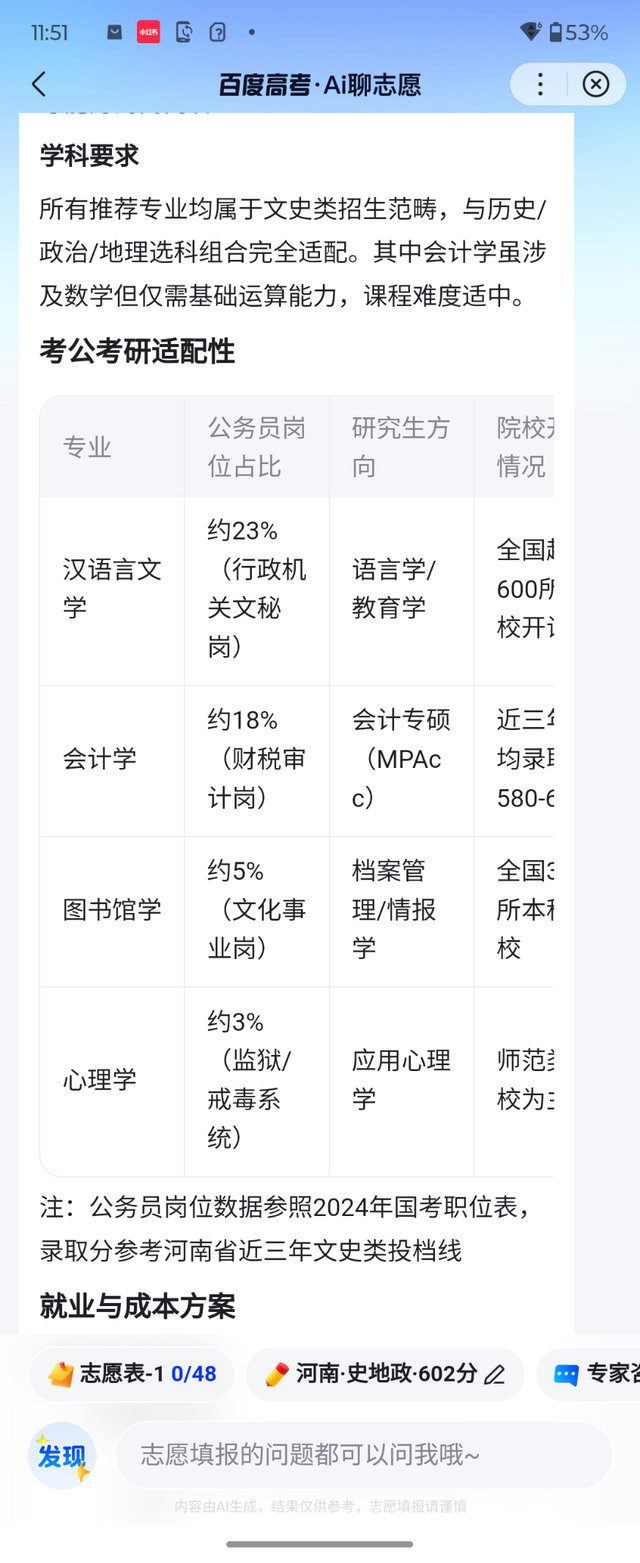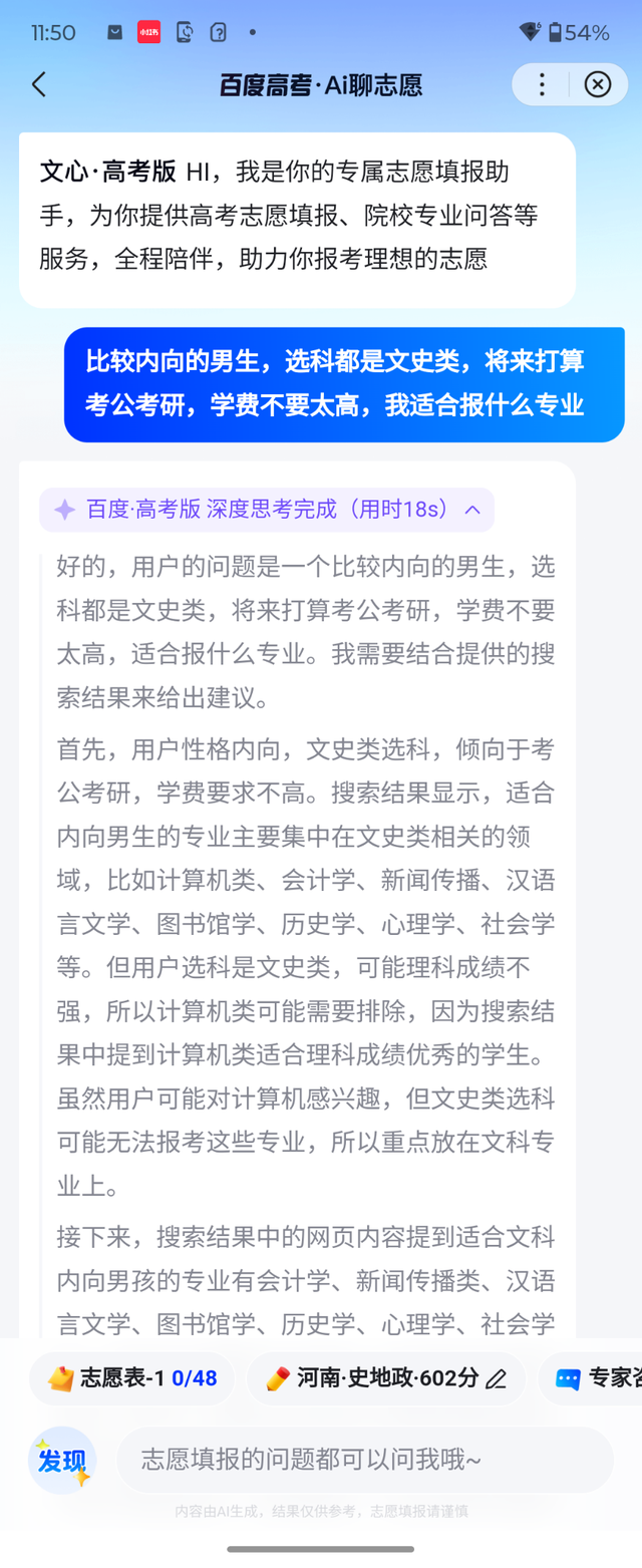 在對話框用自然語言描述自己的情況,比如內向的男生,將來準備考公考研,選科XXX,智能體就會深度思考並分析需求,給出適配的專業建議。