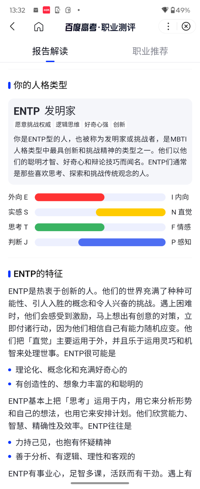 很多考生在選擇專業時,往往忽視了自身性格與專業的適配性。而百度AI志願助手提供的免費MBTI測試,能幫助考生深入瞭解自己的性格類型,探索自己的興趣、優勢和潛在能力。