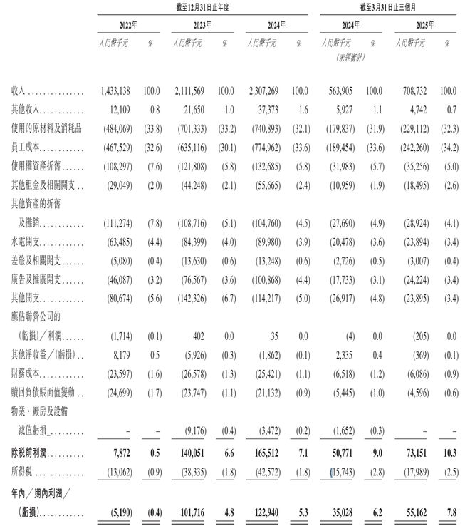 根據招股書顯示,2022年至2024年,巴奴的營收分別為14.33億元、21.12億元、23.07億元,三年增長61%。而公司的淨利潤也從2022年虧損519萬元,到2024年扭虧為盈至1.23億元,經調整淨利潤率從2.9%提升至10.8%。