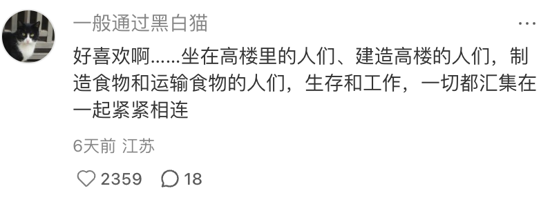 大城市裏討生活的打工人馬上就明晰了作者的巧思:坐在高樓裏的人們、建造高樓的人們、製造食物和運輸食物的人們,生存和工作,一切都在這裏緊緊相連。