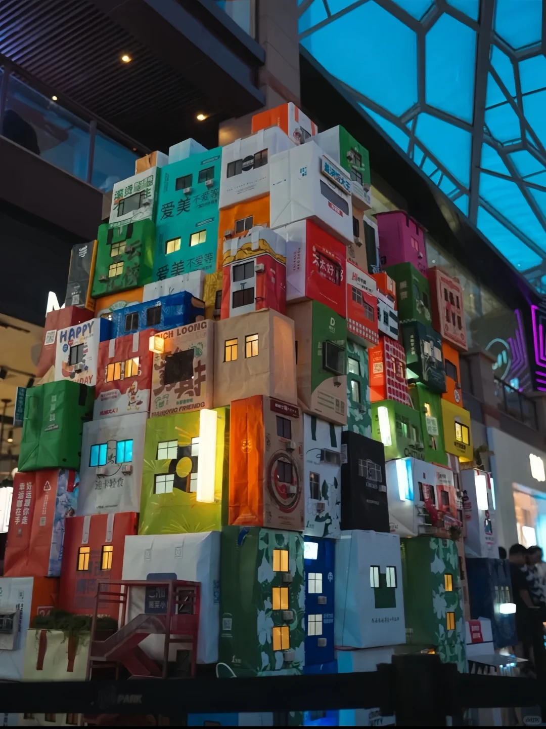 如何具象又精準地呈現當代人的速食生活?用外賣袋搭一座摩天大樓無疑是天才的想法。