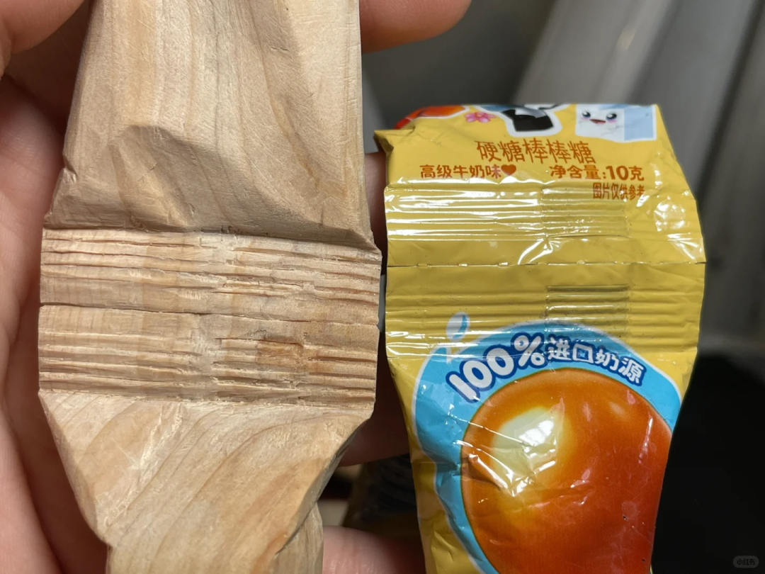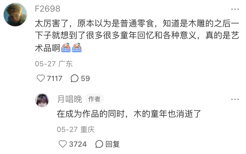 那組被瘋傳的小零食雕塑,作者後來分享了自己的創作經歷:一年前的兒童節,她在重慶的山裏買回了幾塊木材,經過一年的雕刻、上色、變成了今天展出的作品。
