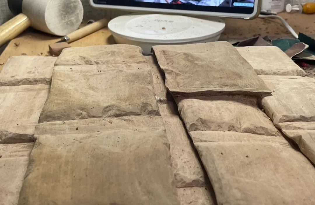 不要驚訝,他們正在圍觀一件藝術品。這牆上掛着的並不是什麼一元一包的童年零食,而是一比一手工雕刻、上色的木雕作品。