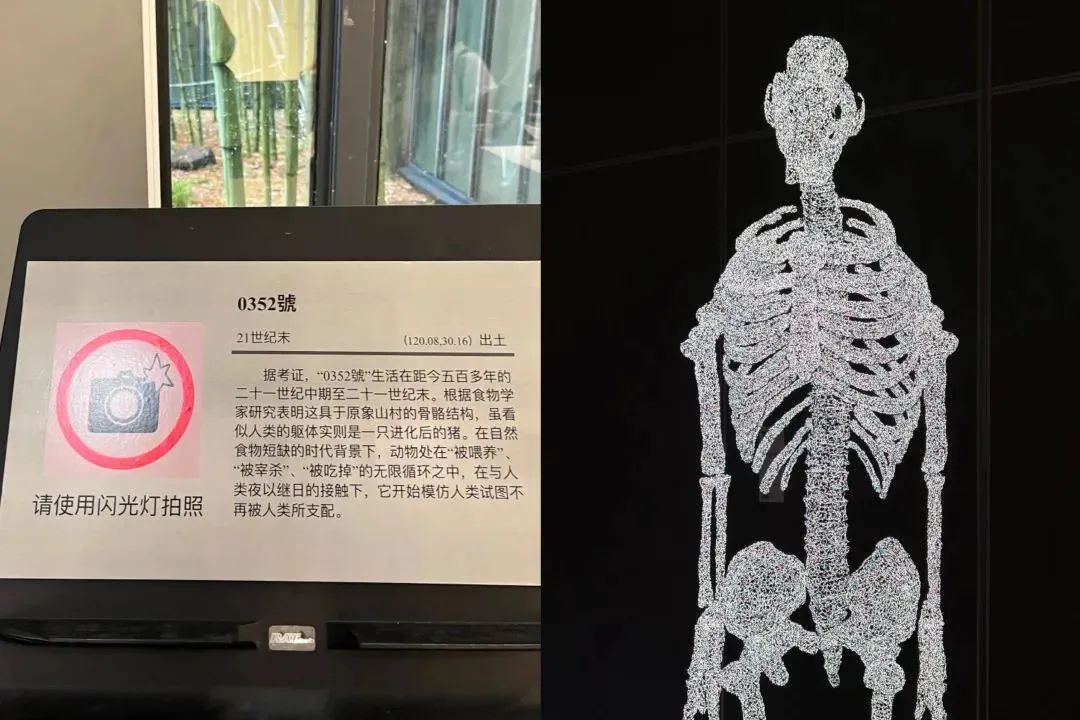 還有另一個很出圈的骨骼展品,旁邊的温馨提示寫着:請使用閃光燈拍照。