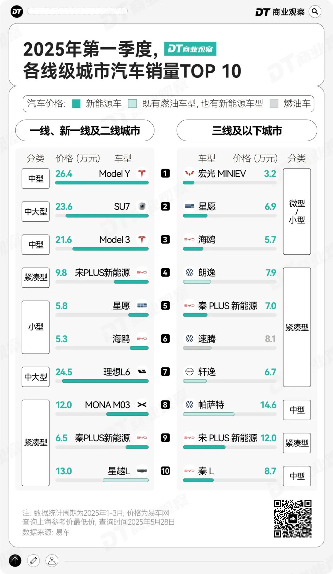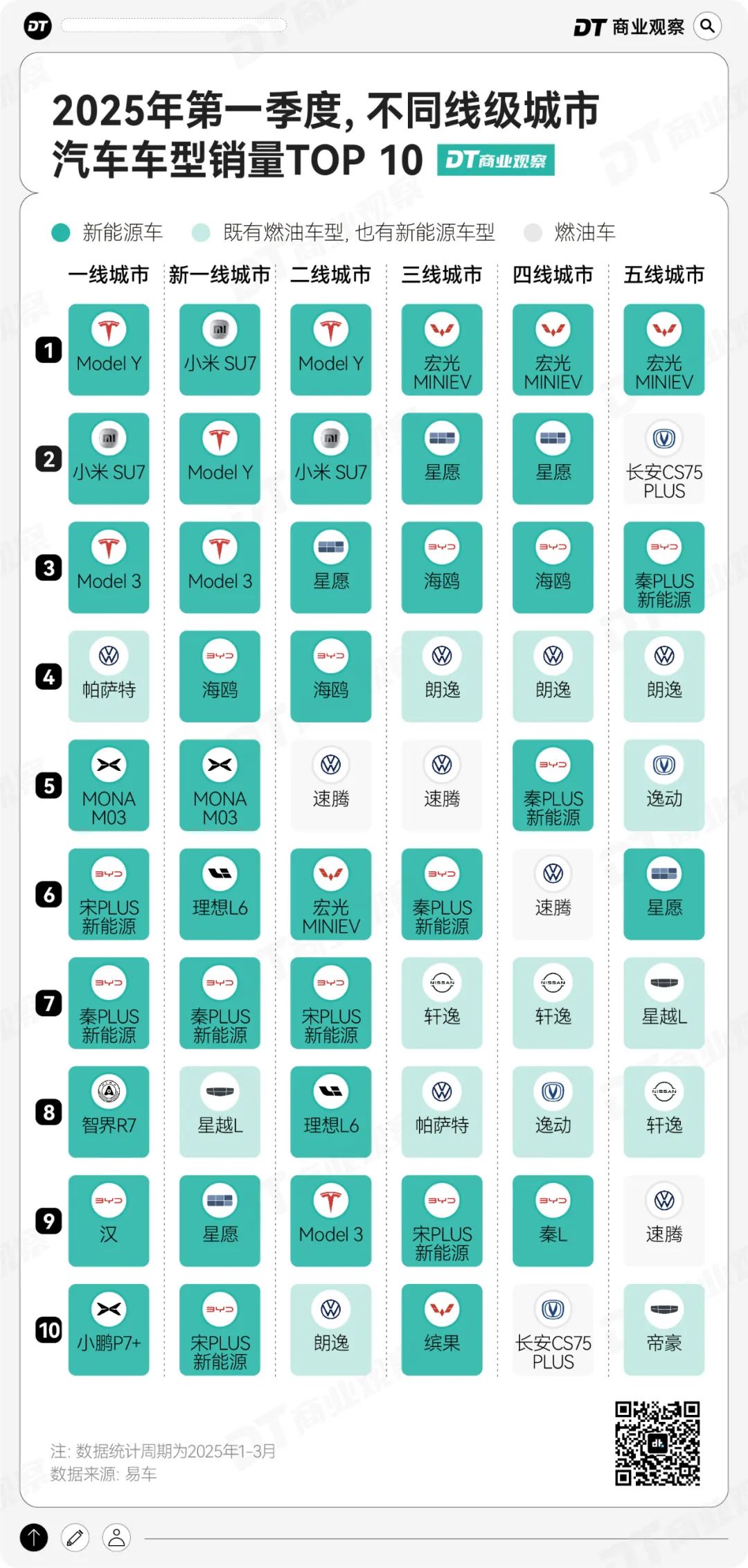 下沉市場的新能源熱潮與差異,首先體現在了暢銷車型的榜單上。根據易車榜發佈的2025年1季度各線城市車型銷量排名,不同線級人羣對車型的喜愛程度展現出比較大的差異。