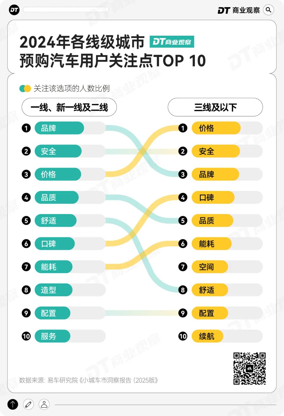 相比較大城市消費者選車時最看重品牌,小城用户在選購車時,最關注的是價格,其次才是安全與品牌。