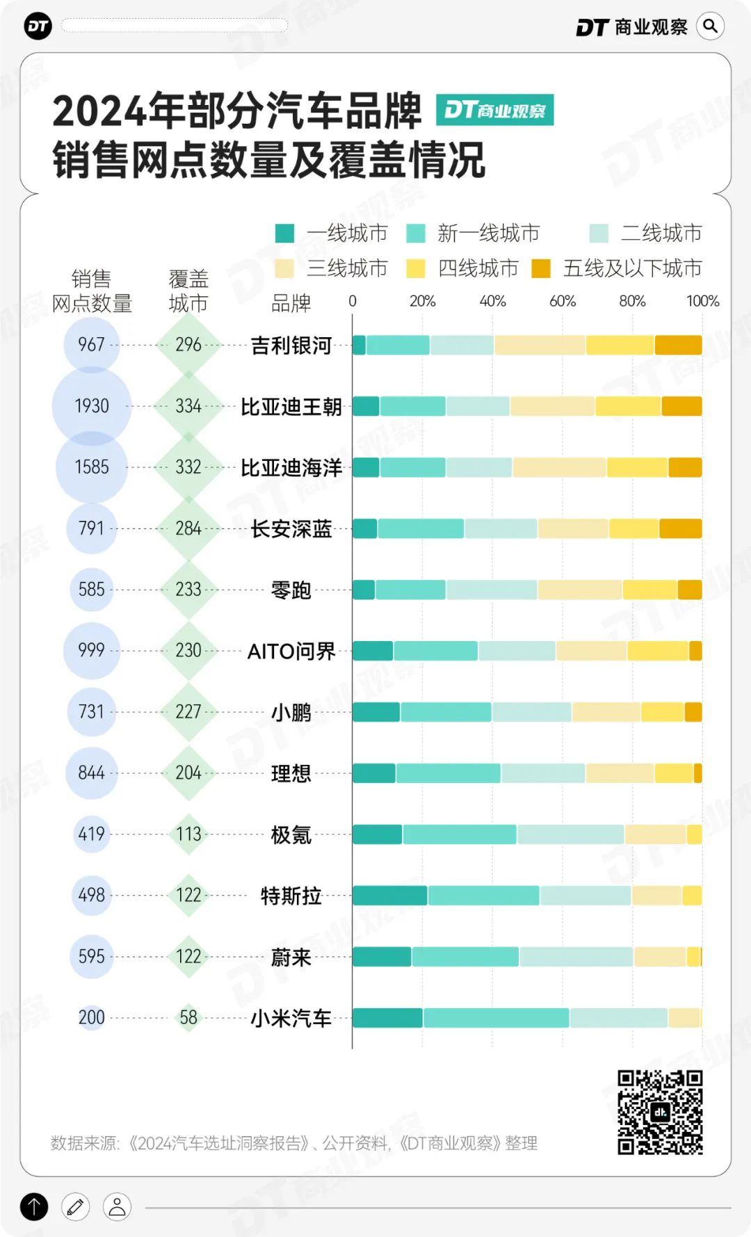 在這場“下鄉大戰”裏,幾個國產品牌衝在了前面。吉利銀河、比亞迪王朝在三線及以下城市網點佔比均超過了50%。