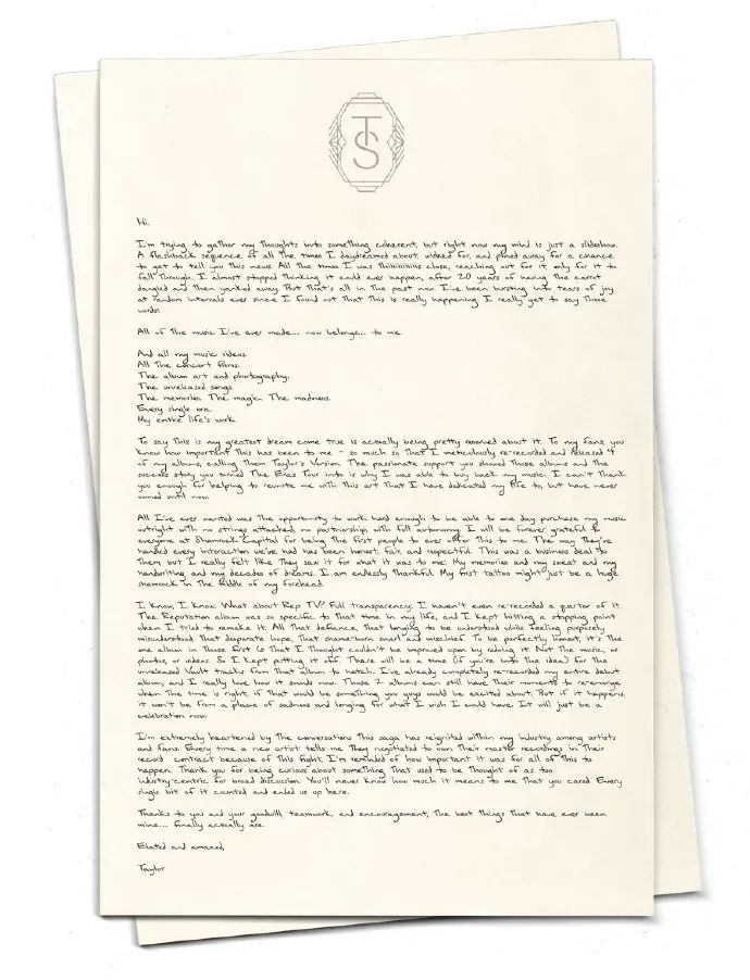 泰勒·斯威夫特在拿回自己的版權後,在INS發了長文陳述自己的心路歷程。長文的最後她説:“我也因這段旅程激發了行業內外的對話而備受鼓舞。每一次新藝術家為了爭取擁有自己的主權而重新談判合約時,我都深深地體會到這場抗爭的重要意義。”