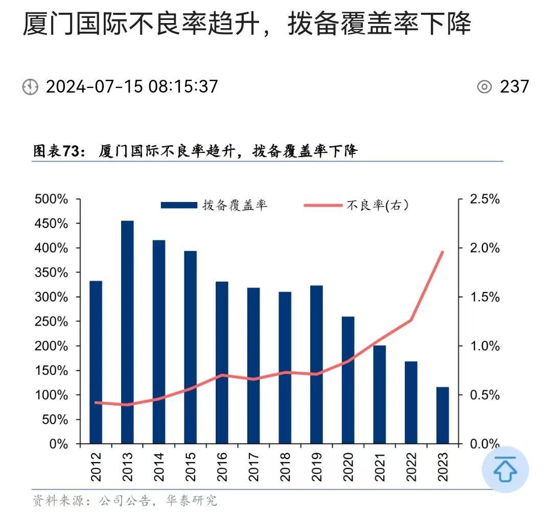 作為銀行資產質量的重要指標,廈門國際銀行的不良貸款率則不斷上升,2020年0.84%,2024年2.12%。而撥備覆蓋率則不斷下降,2020年259.8%,2024年105.47%,2023年就觸及了監管警戒線。