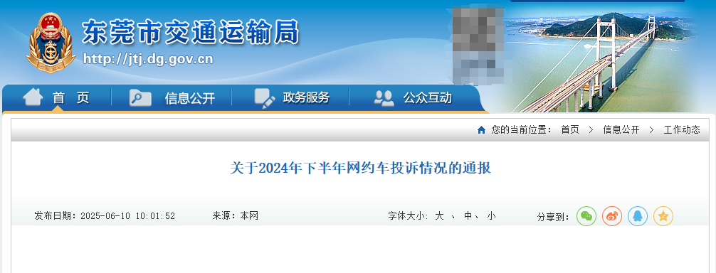 6月10日,為督促各網約車平台和網約車租賃公司加強管理,東莞市交通運輸局對2024年下半年收到的涉及網約車平台和網約車租賃公司的投訴糾紛情況進行通報。