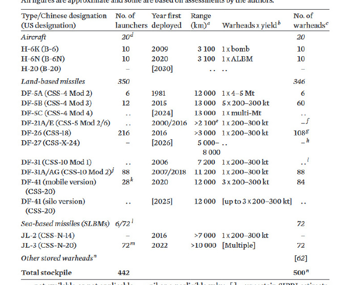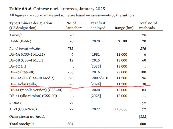到了大家最喜聞樂見的洲際載具方面,今年的SIPRI大手一揮,認為井裏都是東風31,你鱉有他媽320個東風31的井。這意味着未來我軍最多擁有30個東風41的導彈發射井。而在挖好320個井以後,你鱉有導彈但捂地等升值,就造了30個東風31AG往井裏一塞了事兒。也就是説,320個井裏只有30個井能用。
