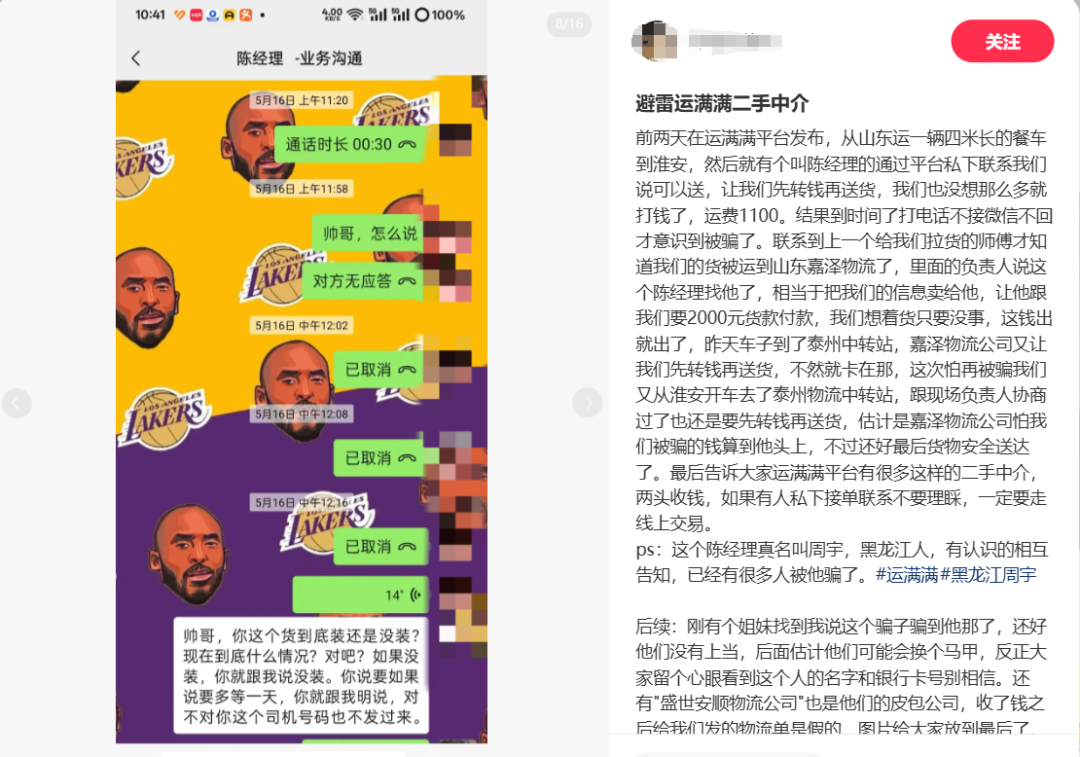 比如,不少用户在小紅書上反饋,在運滿滿平台創建訂單之後,貨運司機或貨運代理公司通過平台私下聯繫到貨主,並要求先轉錢再送貨;而貨主支付運費後,承運方消失了。