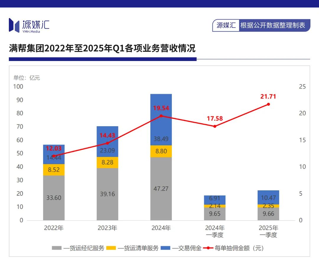 2022年至2024年,滿幫集團已發貨訂單從1.2億上升至1.97億,交易佣金收入從14.4億元上升至38.5億元,2025年一季度進一步同比增長51.5%至10.5億元。折算抽佣金額每單從12.03元上漲至19.54元,2025年第一季度進一步上漲至每單21.71元。