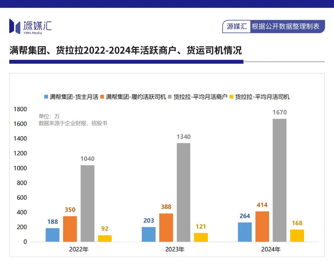 滿幫集團貨主月活,從2022年的188萬上升至2024年的264萬;貨拉拉平均月活商户,則從1040萬上漲至1670萬。活躍貨運司機方面,同期滿幫集團從350萬提升至414萬,貨拉拉則從92萬增至168萬。