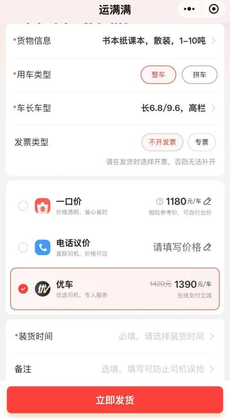 在“運滿滿”微信小程序上,填好裝卸貨地點、物品、用車類型、發票類型(不開發票)之後,就會顯示“一口價”、“優車”兩個選項的費用,但沒有生成訂單。