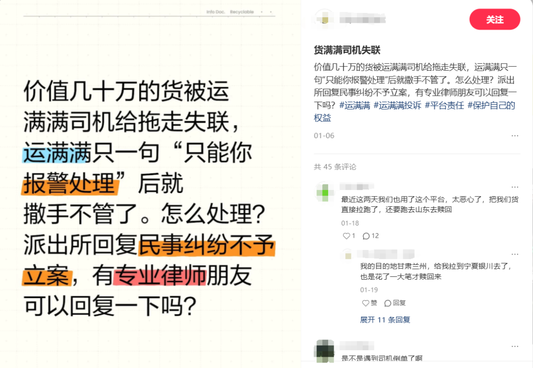 比如,不少用户在小紅書上反饋,在運滿滿平台創建訂單之後,貨運司機或貨運代理公司通過平台私下聯繫到貨主,並要求先轉錢再送貨;而貨主支付運費後,承運方消失了。