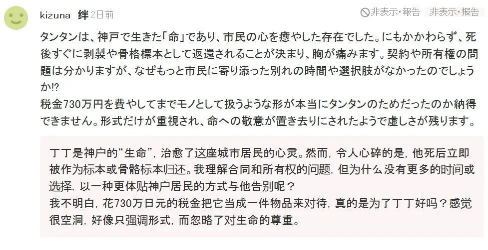 旦旦自2000年阪神大地震後從中國來到神户,成為這座城市復興的象徵,深受市民喜愛。然而,根據中日兩國間的租借協議,大熊貓的屍體所有權歸中國所有,神户市決定將其製成標本後返還中國。這一決定在日本引發了廣泛討論,許多民眾對此表示不解甚至抱怨,認為連大熊貓的屍體都必須歸還中國過於嚴苛。
