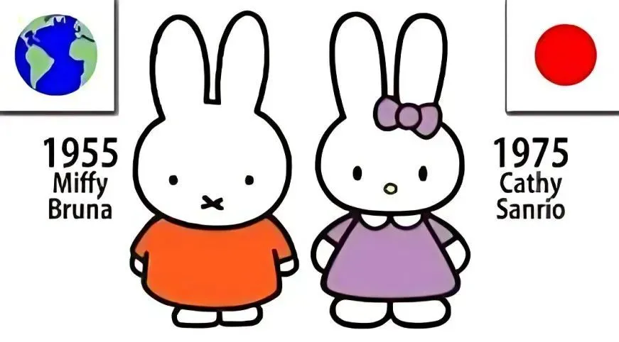 與之類似,全球知名IP凱蒂貓(Hello Kitty)的好友卡西兔(Cathy),則是拷貝了荷蘭畫家迪克·布魯納所創造的米菲兔。
