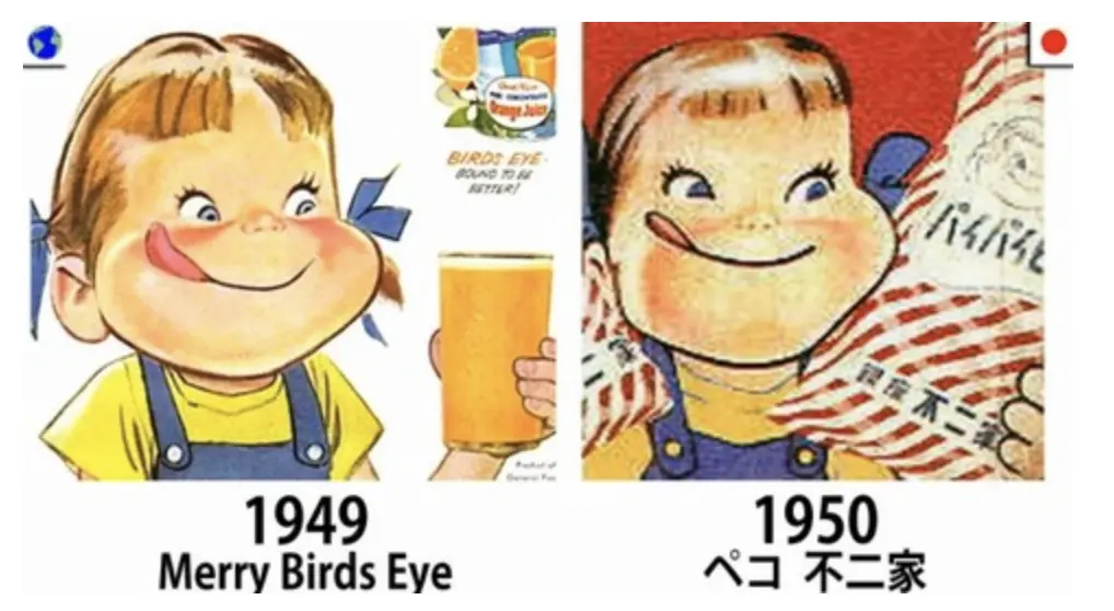 比如知名糕點店不二家的看板女孩“牛奶妹”,照抄了上世紀50年代美國一個做橘子汁的品牌LOGO。
