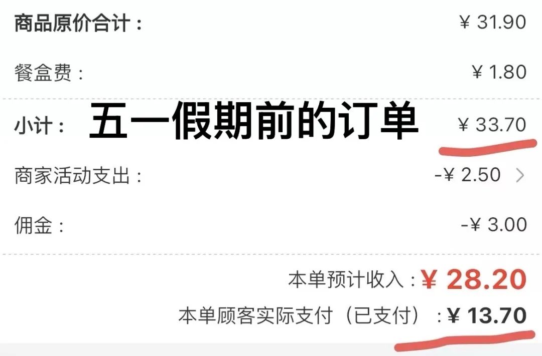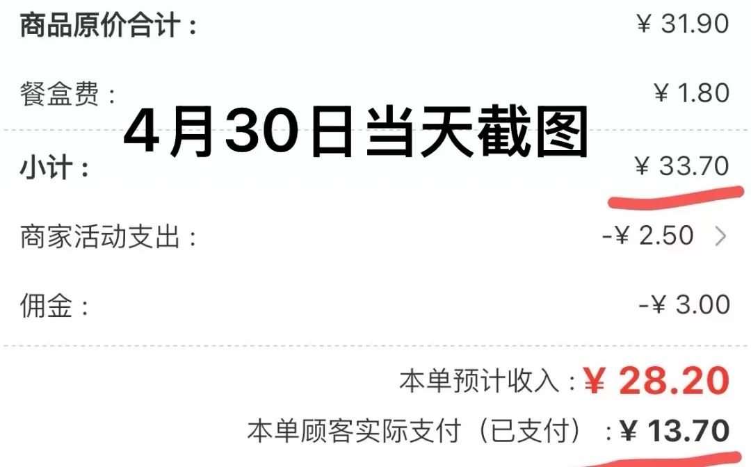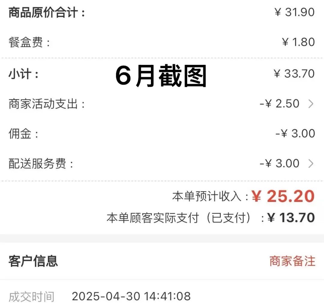 而且,蓓蓓還發現,4 月 30 日的一筆外賣訂單,她當天截的圖上只扣了 3 塊錢佣金和商家活動支出 2.5 元,本單預計收入 28.2 元,6 月份她再倒回去看當時的訂單,同樣的頁面顯示多扣除了一項 3 元錢的配送服務費,而本單預計收入也赫然變成 25.2 元。
