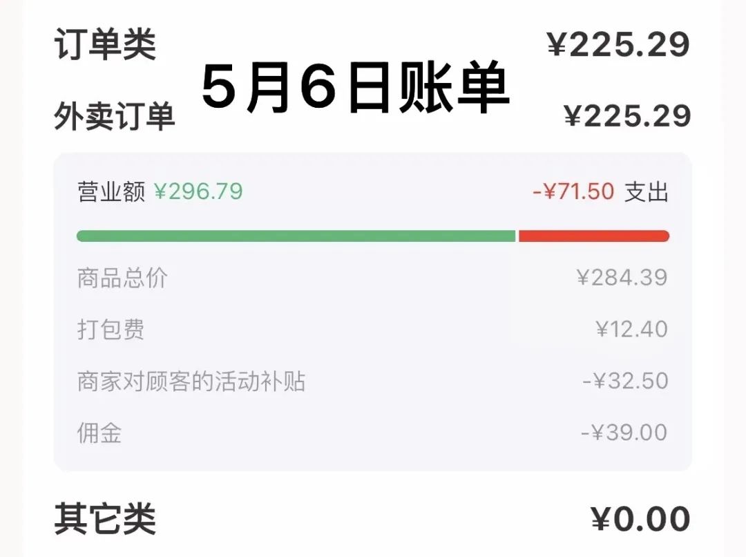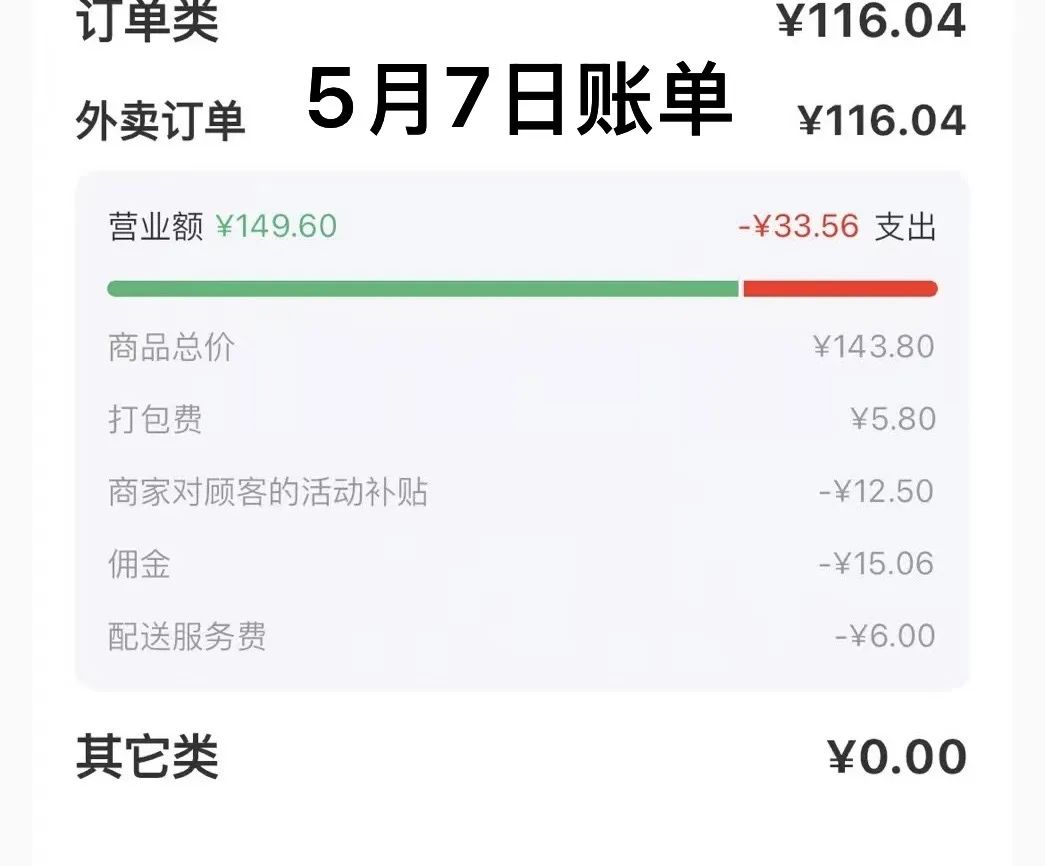 蓓蓓發現,5 月 6 日商家端日賬單中的扣除項,還只有 “ 商家對顧客的活動補貼 ” 和 “ 佣金 ” 兩項,而 5 月 7 日開始,扣除項新增了一個 “ 配送服務費 ”。