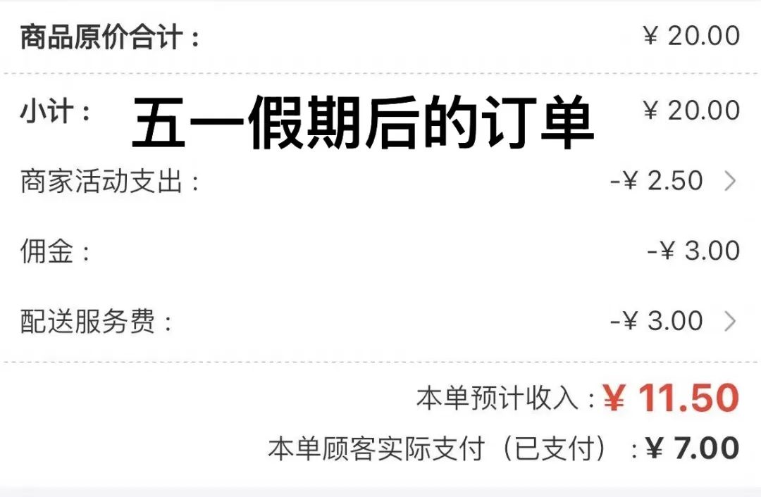 “ 但我發現五一假期結束之後,我每筆訂單在已經扣除了名為 ‘ 佣金 ’ 的 3 元錢的基礎上,又多扣了一個 3 元錢,這個錢叫做 ‘ 配送服務費 ’。” 蓓蓓説。