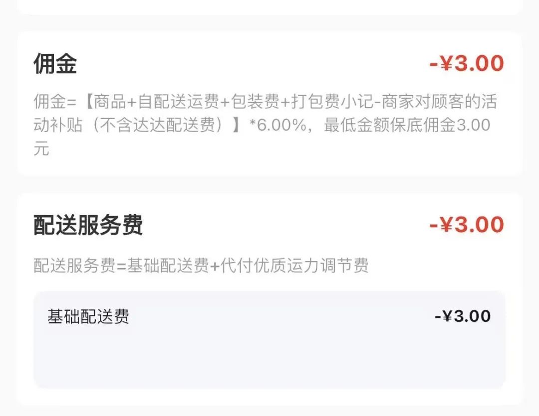 現在,平台後台説明上,對於 “ 佣金 ” 和 “ 配送服務費 ” 這兩個 3 元扣除項的解釋是,佣金系 6% 的扣點,配送服務費系基礎配送費+代付優質運力調節費。
