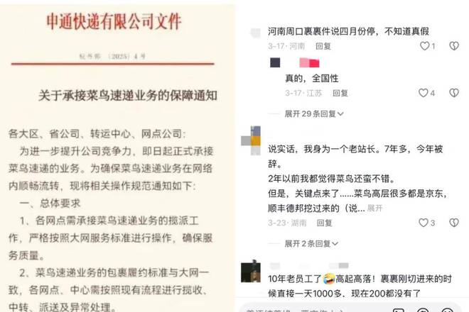 有“裹裹取件”業務的部分站點,日子也不好過。今年3月,申通發佈關於承接菜鳥速遞業務的通知。在社交平台上,多地菜鳥速遞工作人員的説法也印證着通知的內容。多地菜鳥裹裹業務已經不同程度切出去,有的攬收業務直接切給申通,有的則是用申通運輸。