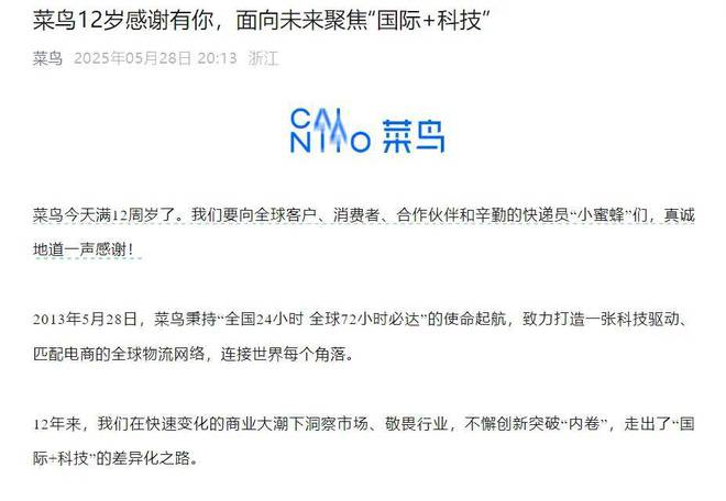 5月28日,菜鳥在12週年的官方推文中明確,面向未來,菜鳥要聚焦“國際+科技”,要在全球化和市場化的道路上前行。