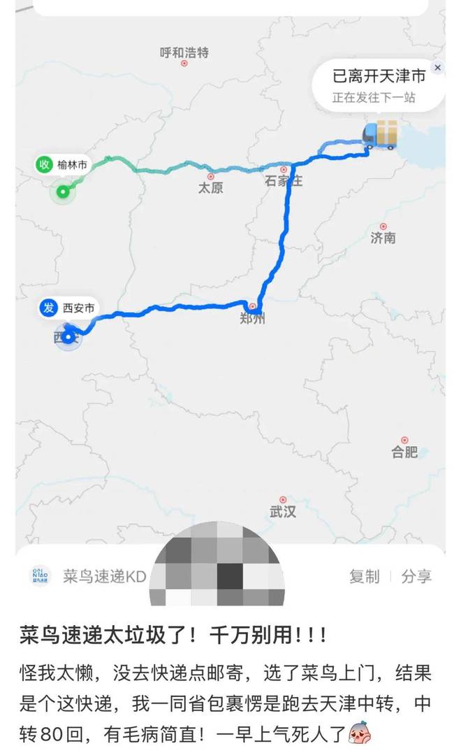 經調查發現,類似情況並不是少數。一位用户發帖表示,只是寄一個陝西同省件,結果菜鳥速遞先去天津中轉,又繞道呼和浩特。還有一位用户表示,3月23日從杭州寄出快遞,目的地是長沙,結果3月28日這個快遞還在杭州徘徊。