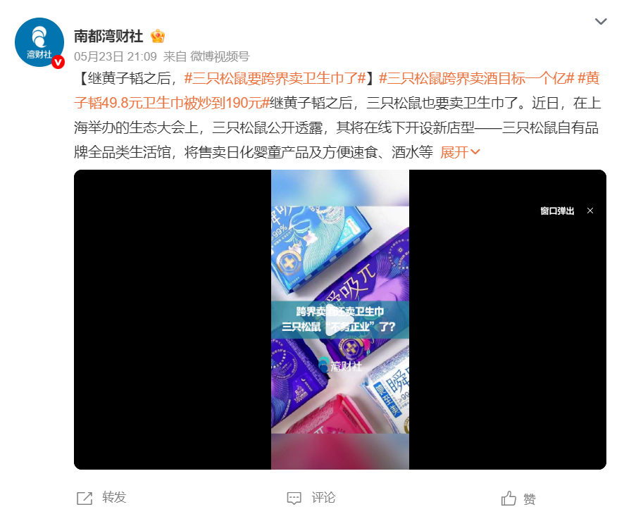 實際上,量販零食僅是三隻松鼠多元化戰略版圖中的一個細分方向。酒業、乳業、寵物食品、衞生巾……三隻松鼠的目標,是成為全品類自有品牌零售商。