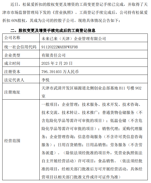 今年5月,三隻松鼠宣佈,愛折扣的股權變更及增資的工商變更登記手續已完成,並取得了天津市市場監督管理局下發的《營業執照》。工商登記手續完成後,公司持有愛折扣 60%股權,其成為公司的控股子公司。