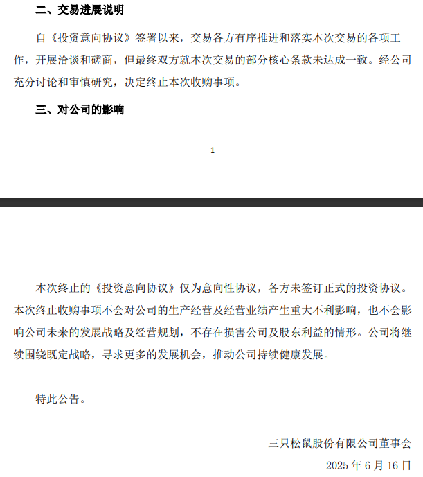 時隔半年多,三隻松鼠收購湖南愛零食科技有限公司(以下簡稱“愛零食”)的計劃告吹了。6月16日,三隻松鼠發佈公告稱,自《投資意向協議》簽署以來,交易各方有序推進和落實本次交易的各項工作,開展洽談和磋商,但最終雙方就本次交易的部分核心條款未達成一致。經公司充分討論和審慎研究,決定終止本次收購事項。