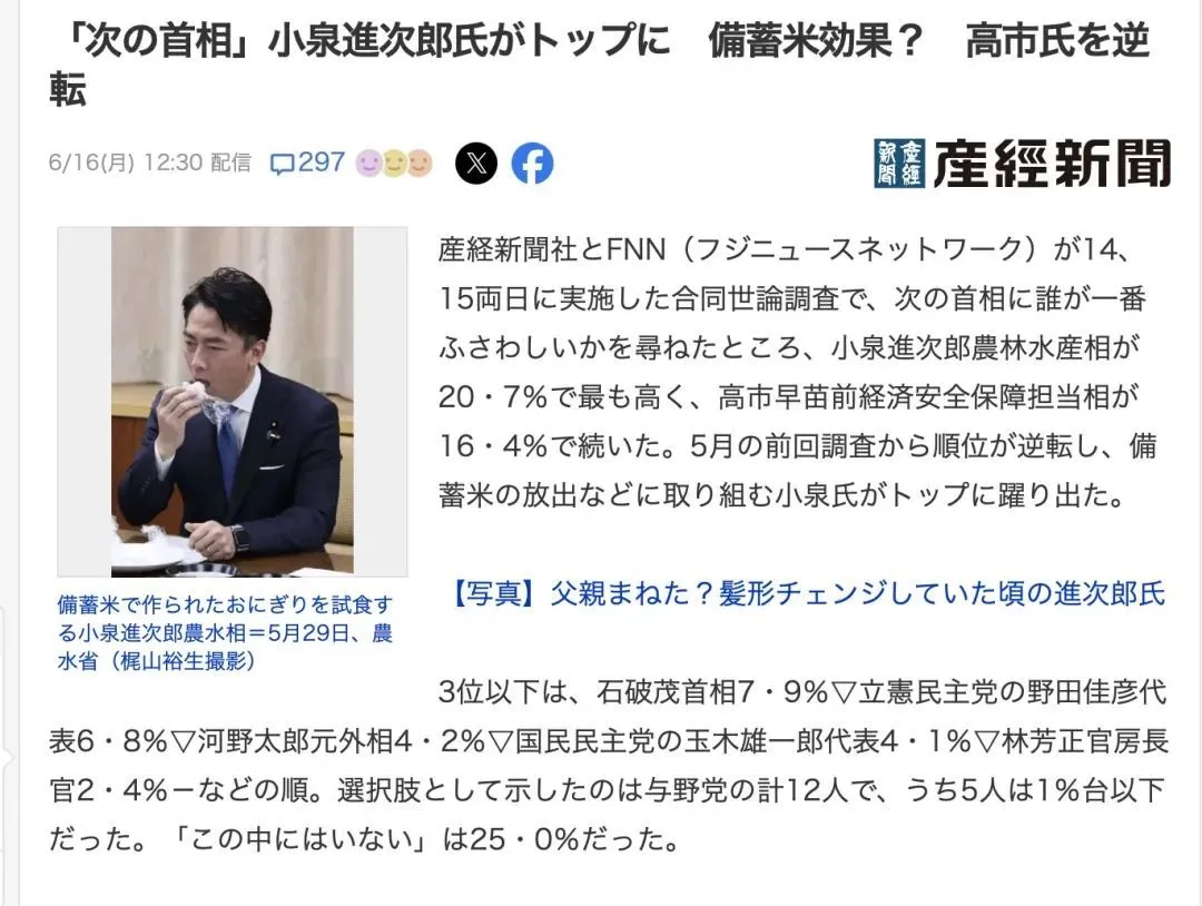 轉機出現在小泉進次郎接任農林水產大臣之後。在共同社5月25日公佈的民調中,石破內閣的支持率回升4.3個百分點至31.7%,顯現出立竿見影的提振效果。不過,44.7%的受訪者依然認為米價目標“不夠低”。