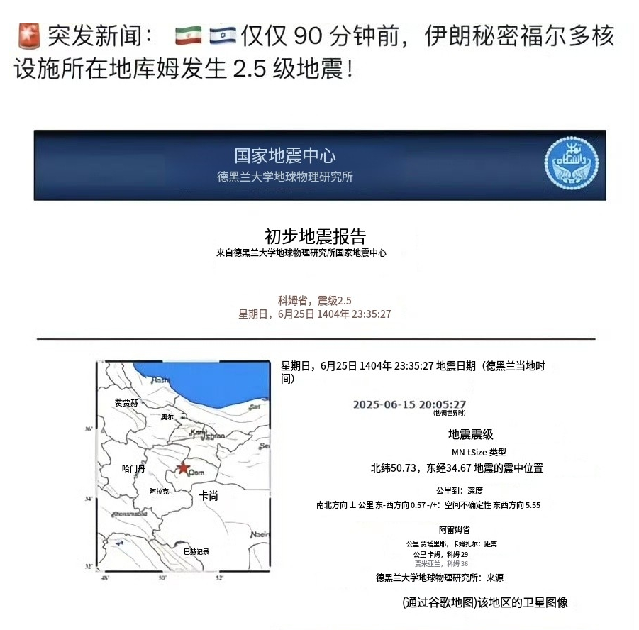 首先伊朗做了一件很錯誤的事情(當然棉花絮不排除是西方惡意散佈的虛假信息)。消息稱伊朗秘密福爾多核設施所在地庫姆發生 2.5 級地震!