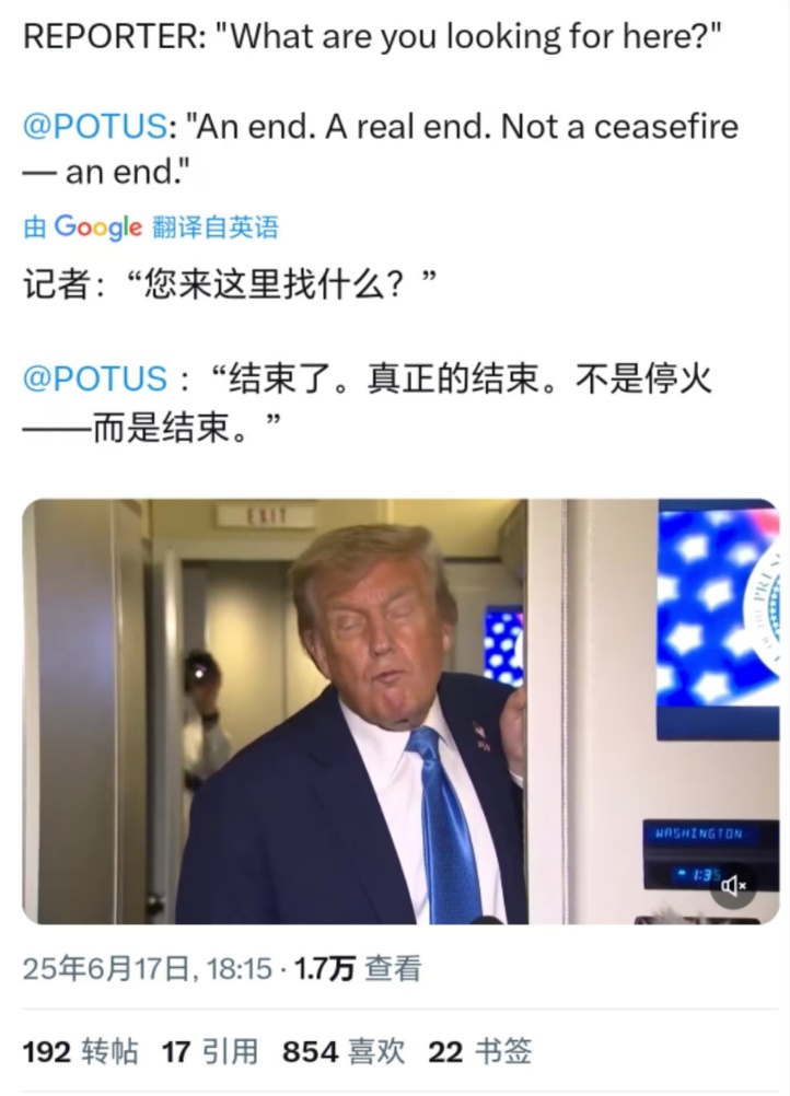 記者:您尋求什麼?特朗普:一個終結。真正的終結,不是停火——而是結束