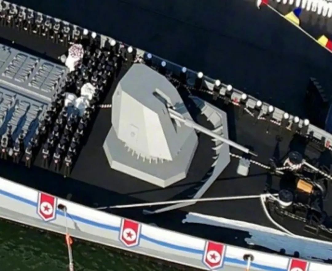 新型127毫米艦炮。這款艦炮從外形看,似乎是直接照抄意大利的奧托OTO-127/64型127毫米艦炮,採用隱身外殼,拋殼設計與奧托127毫米艦炮一模一樣,都採用炮管上拋殼設計。