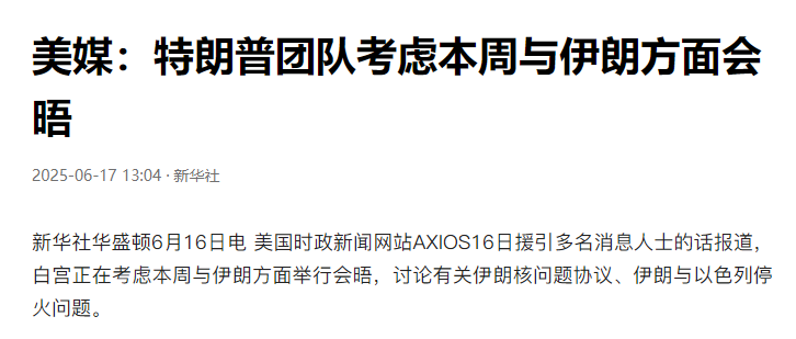另一個是華盛頓郵報、美國時政新聞網等媒體引用多名消息人士的話説,白宮正在考慮本週與伊朗方面舉行會晤,討論有關伊朗核問題協議、伊朗與以色列停火問題。