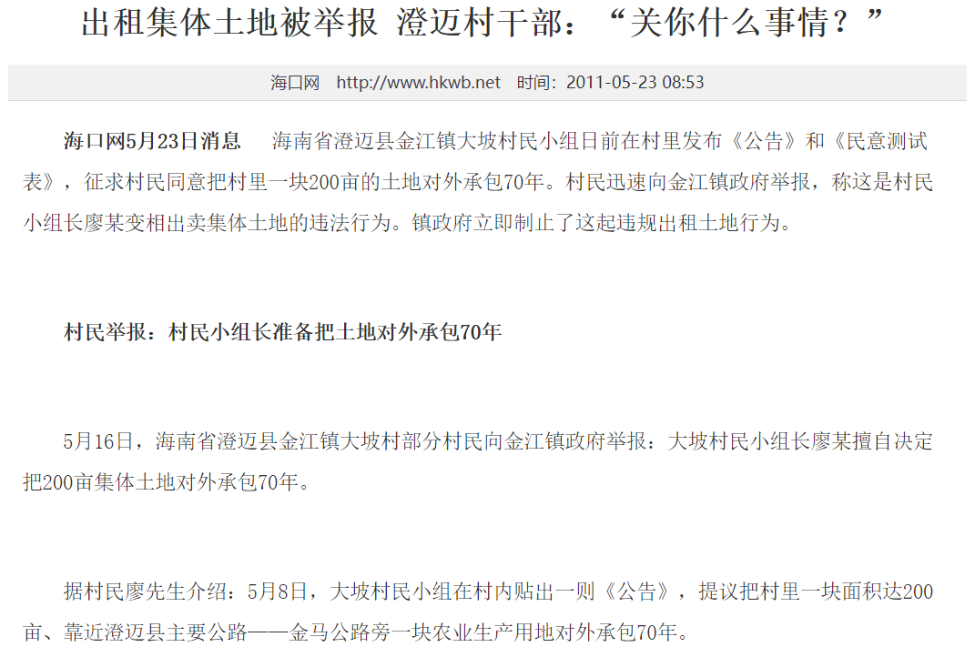 海南澄邁縣有一個金江鎮,金江鎮裏有一個大坡村,在2011年,這個村的一個小組長廖某就能擅自作主,把200畝集體土地租出去。
