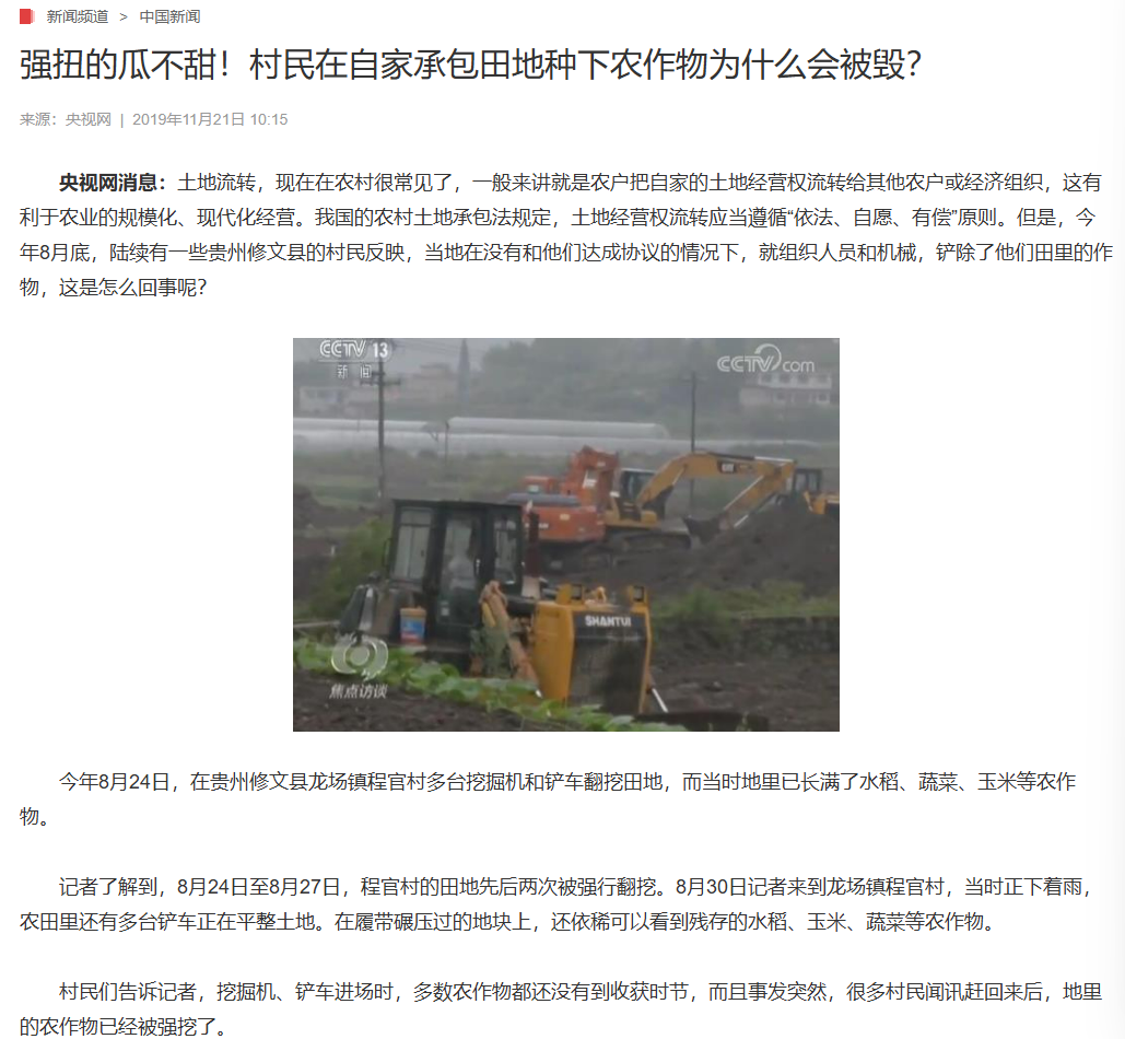 2019年8月,幾台挖掘機和剷車把貴州修文縣龍場鎮程官村老鄉種的農作物給挖了。