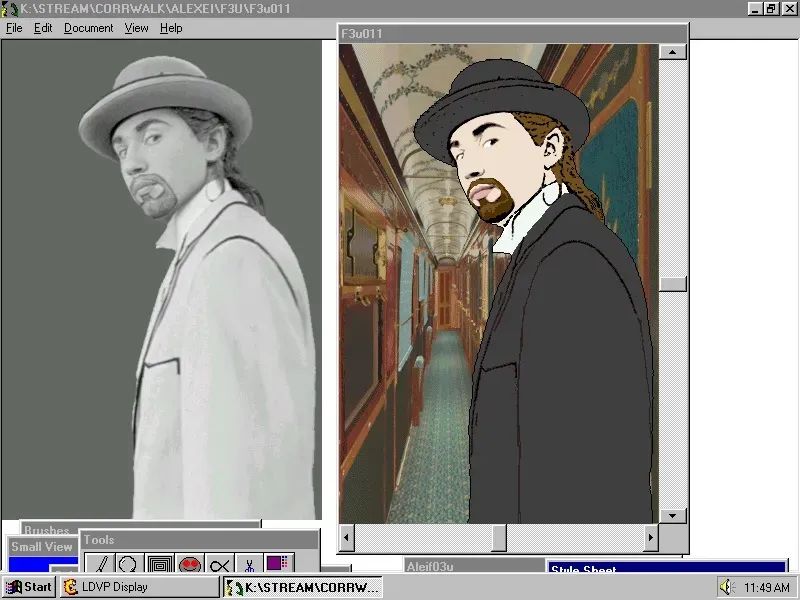 在《最後的快車》開發期間,麥齊納和他的團隊採用了轉描動畫技術——先拍攝演員表演的場景,然後再將其轉變成手繪動畫。麥齊納知道,為了確保劇情能夠對玩家產生足夠的吸引力,他必須將這項技術發揮到極致。如今回頭來看,與上世紀90年代FMV遊戲大不一樣的美術風格,恰恰是《最後的快車》的魅力不因時間推移而褪色的關鍵所在。