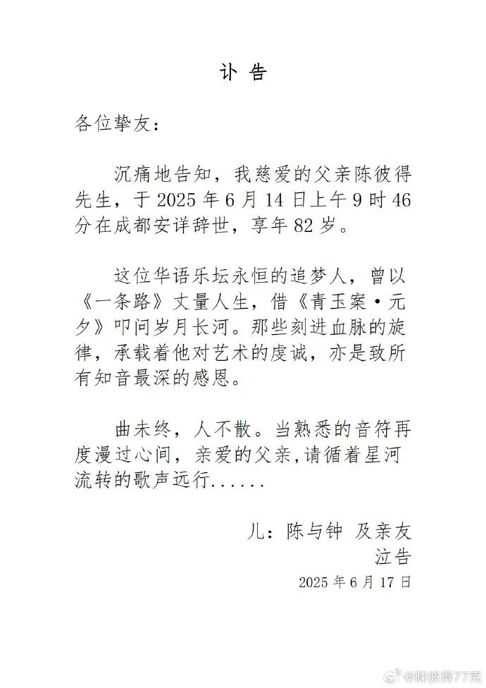 6月17日,陳彼得之子發佈訃告,其父陳彼得於2025年6月14日上午9時46分在成都安詳辭世,享年82歲。